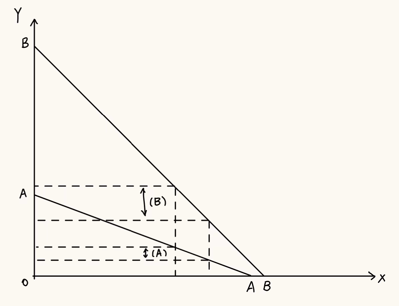 The opportunity cost ratios are reflected in the gradient of the PPC. In the following example, A has a comparative advantage in making good X.